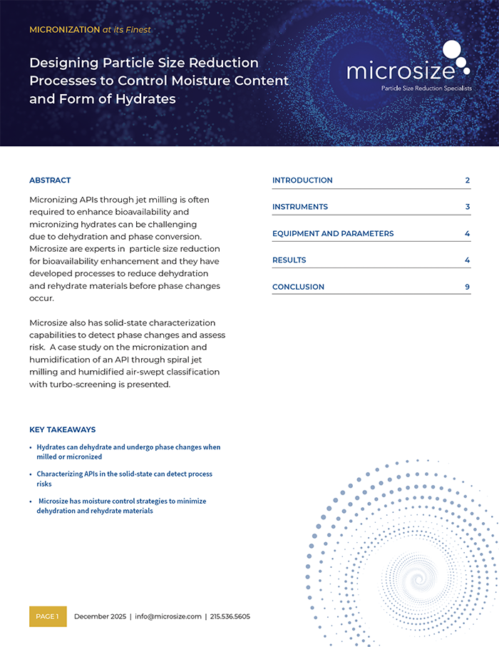 Micronizing APIs through jet milling is often required to enhance bioavailability and micronizing hydrates can be challenging due to dehydration and phase conversion. Microsize are experts in particle size reduction for bioavailability enhancement and they have developed processes to reduce dehydration and rehydrate materials before phase changes occur.
